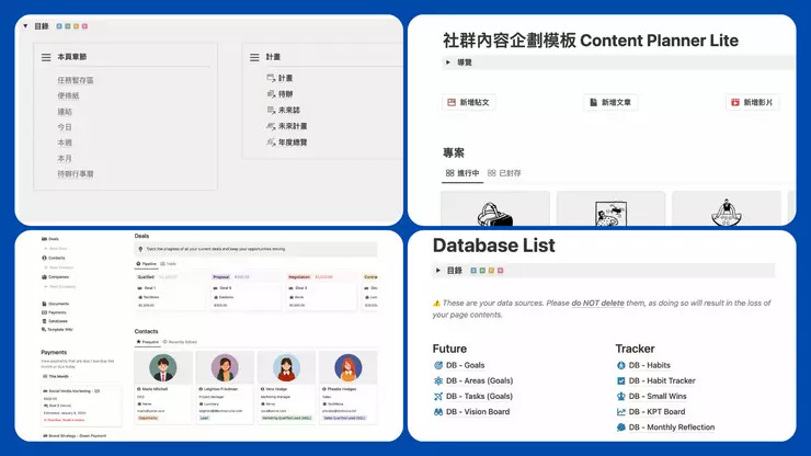 舉例:在我的 CRM (客戶關係管理) 模板中,有客戶資訊、合作專案、款項、每月報告、待辦、CRM 聯繫活動紀錄、目標管理等功能,我給各個功能獨立的一頁,在主頁只顯示常用的資訊、當期或近一個月的紀錄,如果需要了解各項細節,可以透過導覽列或側邊欄的連結前往。