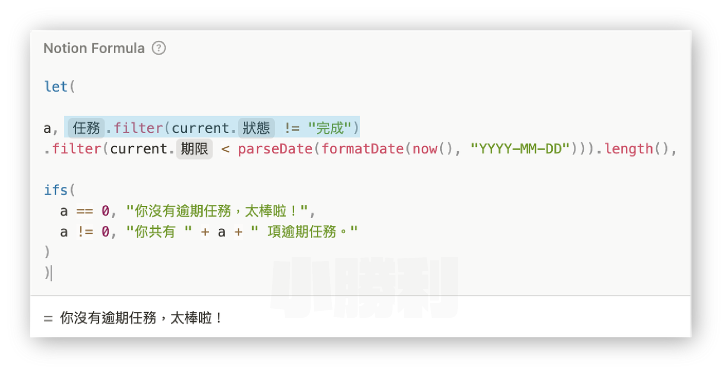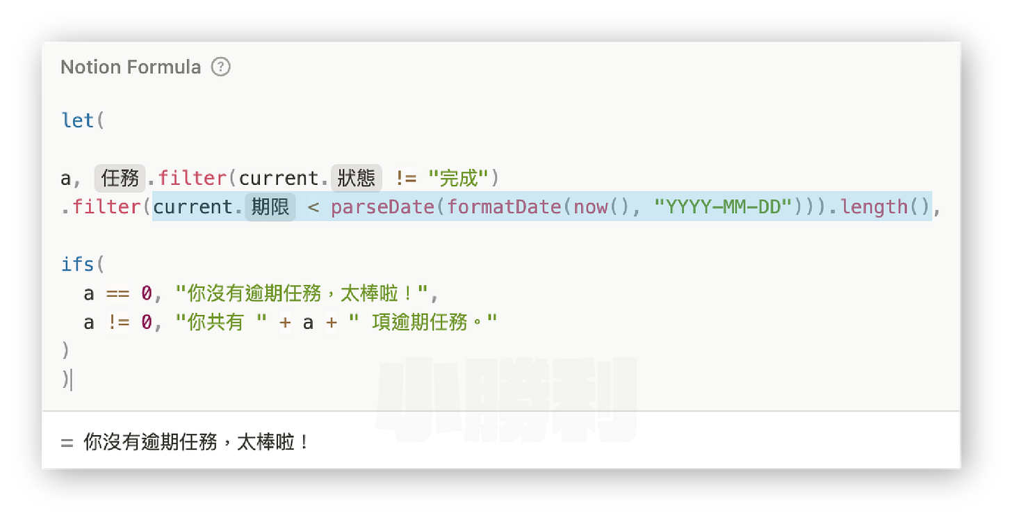 prop(”任務”).filter(current.prop("期限") < parseDate(formatDate(now(), "YYYY-MM-DD")))公式簡化呈現:任務.filter(current.期限 < 今天)