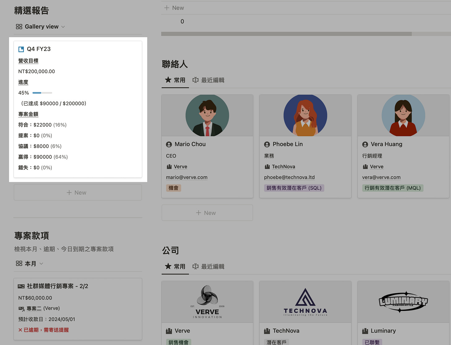 例如我的 CRM Elite 客戶關係暨專案管理模板(英文版)中,我在各個頁面的側邊欄都放上當期業績的報表,也在任務、聯絡人、款項追蹤等各個頁面中使用公告欄統整資訊。