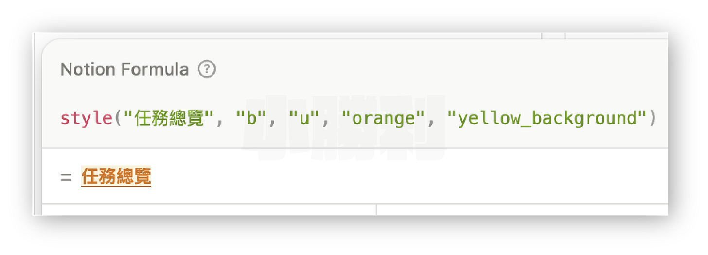 以粗體+底線+橘色字+黃背景呈現「任務總覽」這四個字的公式: