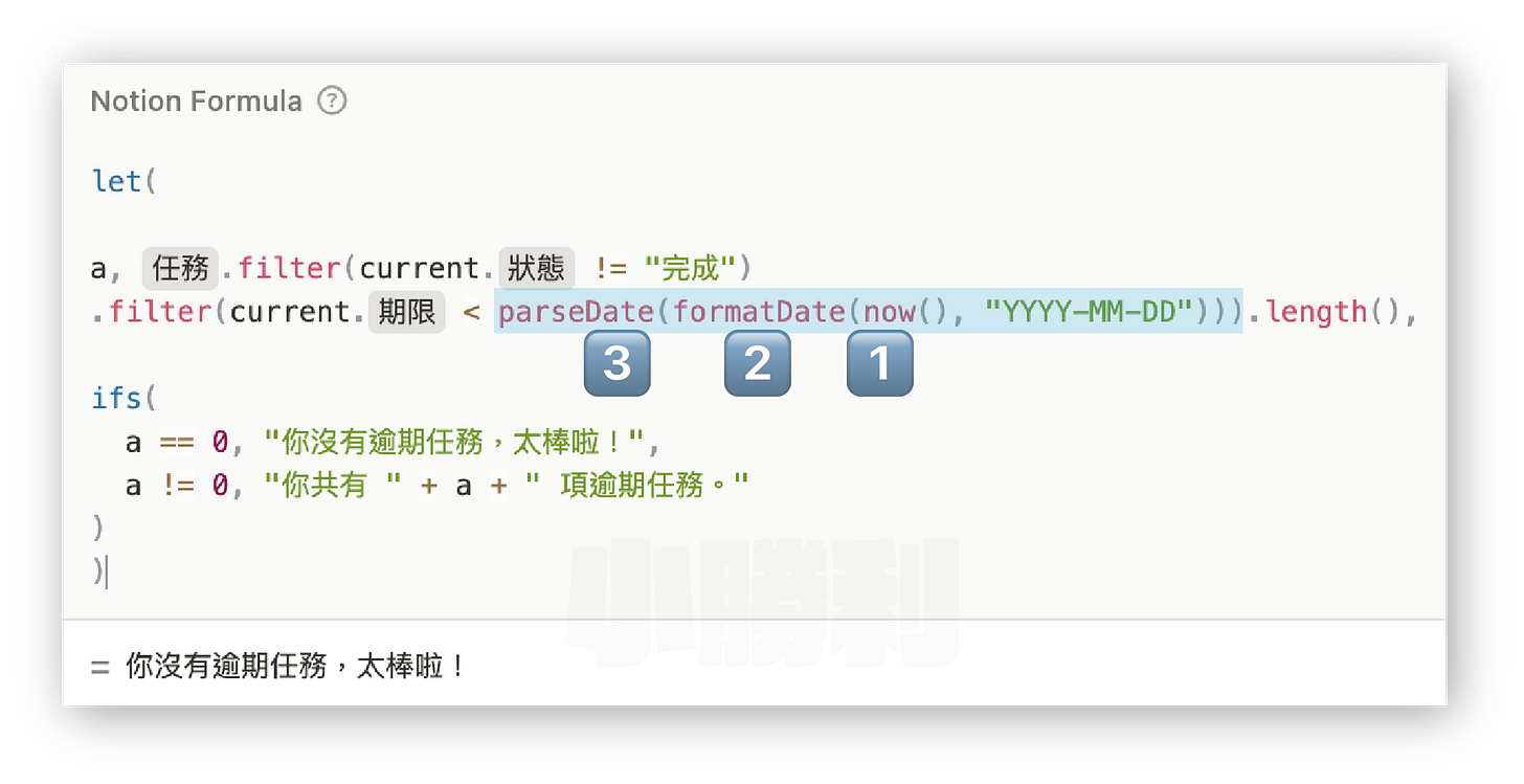 2️⃣ 我們只想要當下的日期,不要時間(一般來說,任務期限若沒有設定時間,預設都會認為他是 0:00,因此如果只用 now(),當天到期的任務都會被標示成逾期)使用 formatDate(now(), "YYYY-MM-DD") 公式來抓取日期。