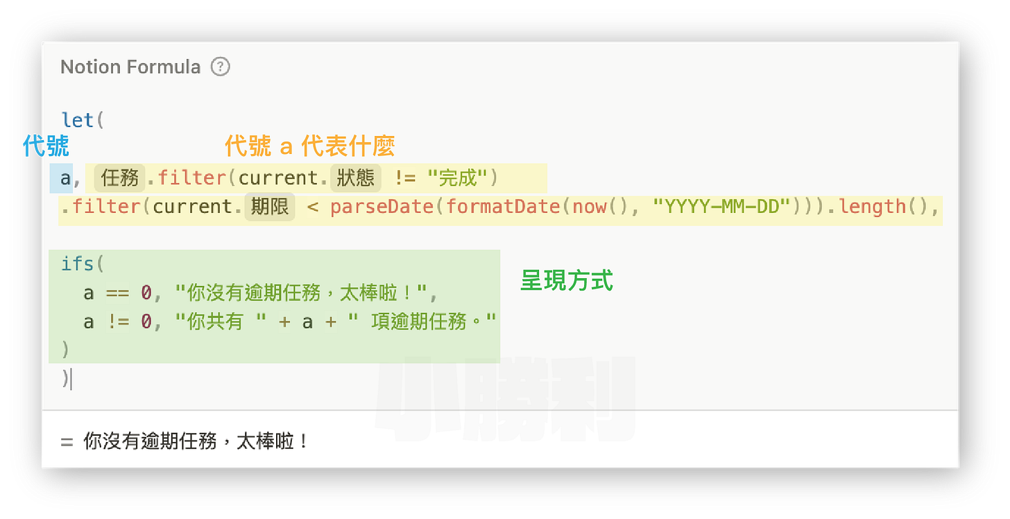 let()就像數學公式用 x 和 y 來代表變數一樣,他的組成是 let(代號, 代表物, 呈現方式)